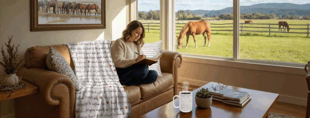 You’ll find guides and ebooks designed to bring peace and presence to your days, a peek at new projects in the works, and a curated selection of heartfelt gifts from my Etsy and Redbubble collections — each inspired by the simple beauty of horses, nature, and home.